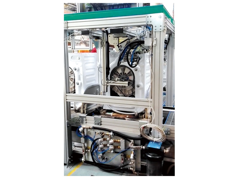上海博諾自主研發(fā)的全自動站位式功能檢測,型式為站位式運行,洗衣機運行至檢測工位,自動插拔進水閥、排水管、供電插座,檢測臺位自動運行對滾筒洗衣機各項功能進行跟蹤檢測。